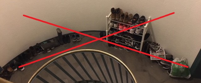 Det betyr at det ikke skal oppbevares sko/støver/ski osv i trappeoppgangen. Likedan skal det heller ikke stå ting i baktrappen. Dette er svært viktig også fra et HMS-perspektiv, da den er en rømningsvei.